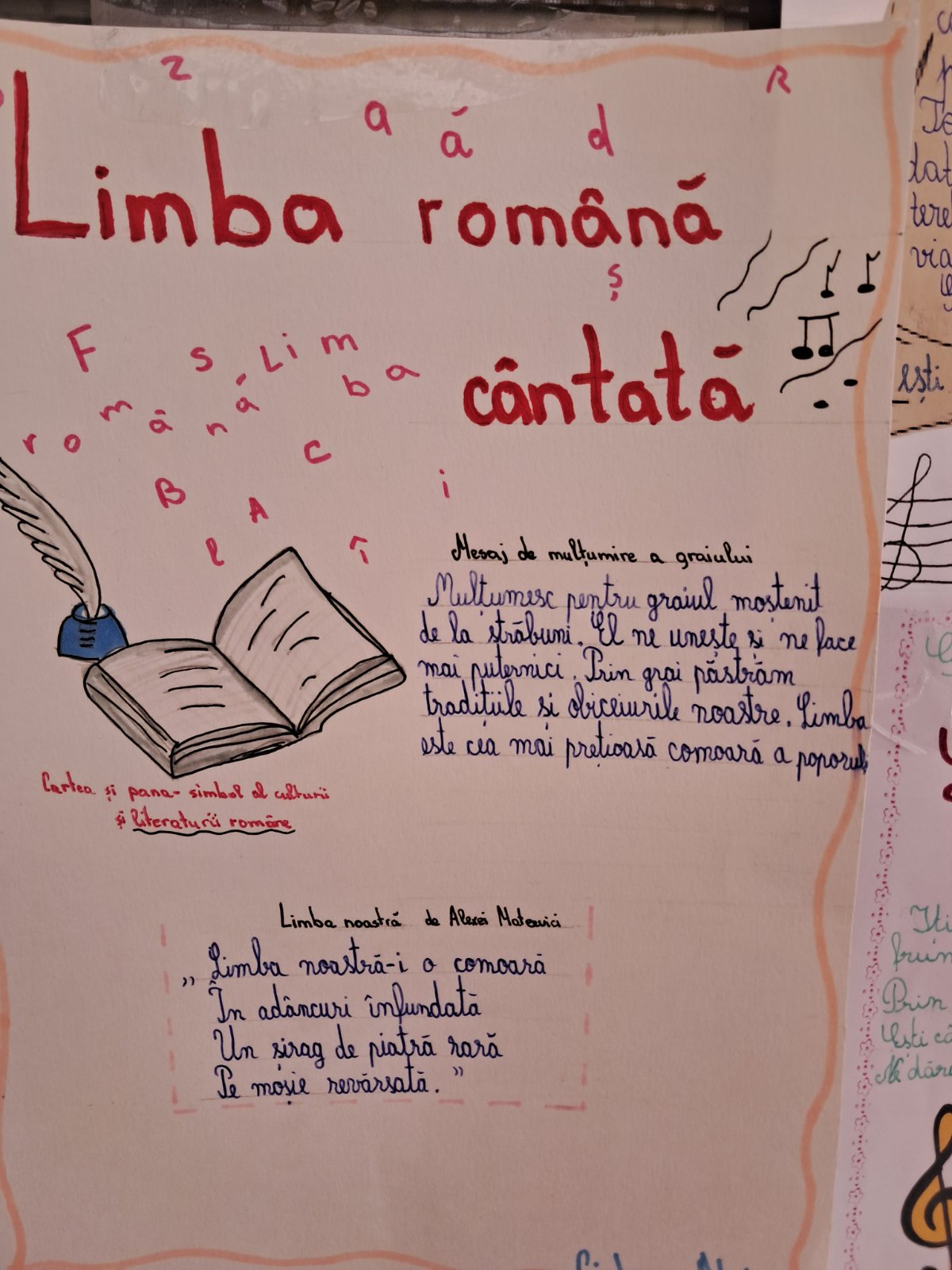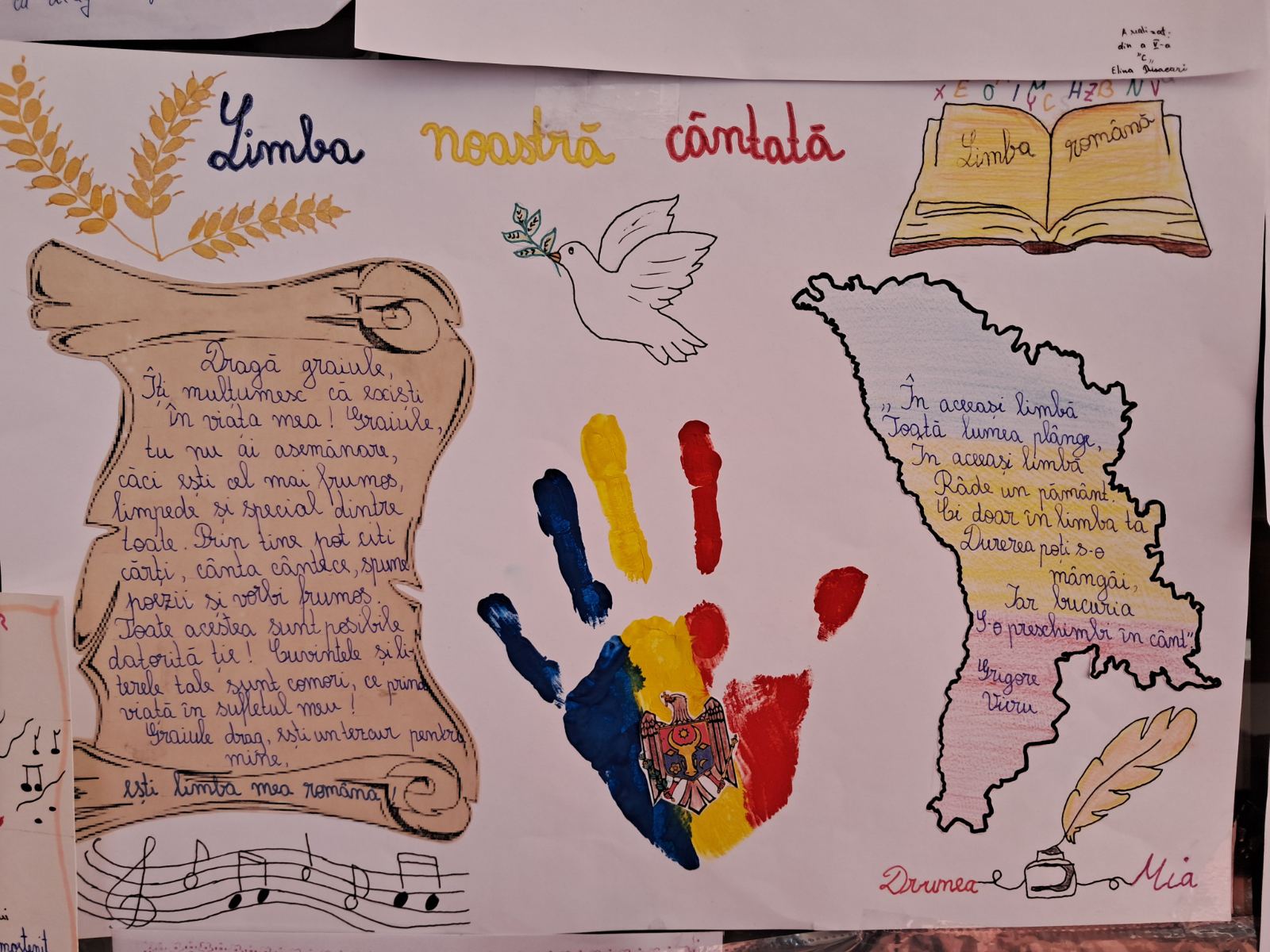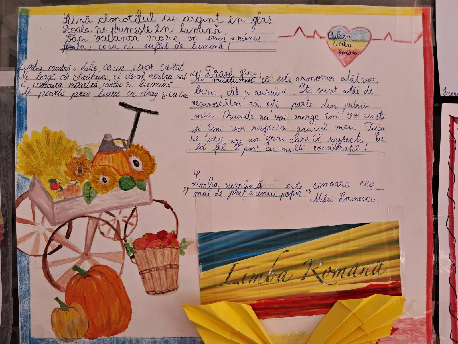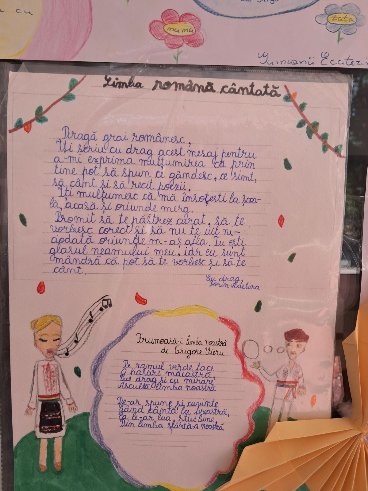 Copiii au îmbinat desenul și poezia, redând prin culori și versuri simbolurile statului, dar și frumusețea limbii noastre. Fiecare elev a scris o dedicație sau un gând de recunoștință adresat limbii române, exprimând prin cuvinte simple dragostea și respectul față de tezaurul spiritual al neamului.